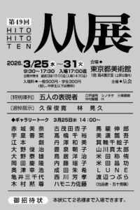 2026.3.15 / 最終更新日 : 2026.3.15 木村浩之 News 第49回 人人展開催のお知らせ 今年も人人展の季節がやってまいりました。 今回は近年取り組んでいた墨絵を展示致します。墨を使った風景、心象風景の作品です。 会期中は上野の桜も見頃になるかと思います。 ぜひ会場でご覧ください。 第49回 人人展 (HITO HITO TEN) 会期: 2026年3月25日(水)~31日(火) 時間: 9:30~17:30(入場17:00まで) ※会期中無休|最終日は 15:00(入場14:30まで) 会場: 東京都美術館 1階 第4展示室(上野公園内) 入場料: 一般 500円 学生 300円(ただし、中学生以下は無料) 主催: 人人会